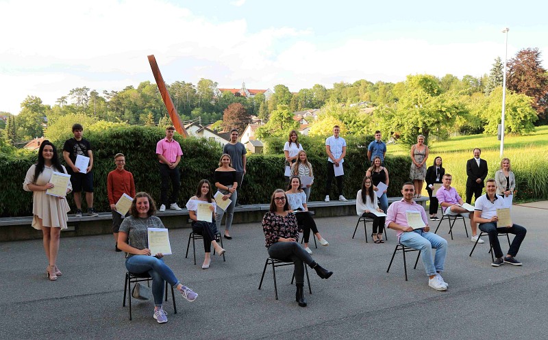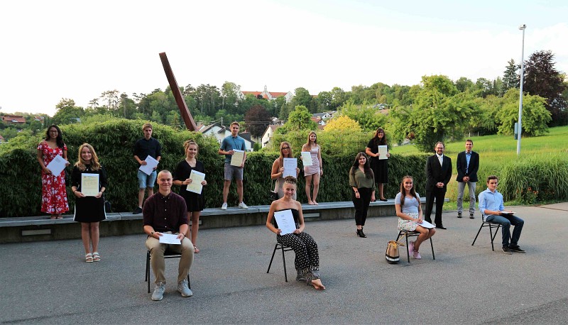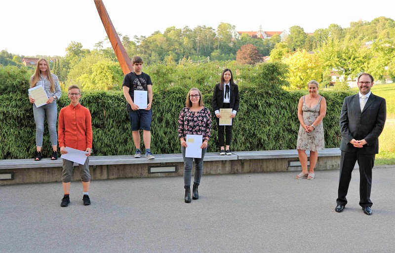 Schulleiter Frank Steinhart oblag es, die Preise und Belobigungen für gute bzw. hervorragende Lernleistungen zu übergeben. Belobigungen erhielten Samira Goitom, Jasmin Hepp, Tabea Horber, Timo Riester, Leon Schwab, Lena Siber, Moritz Tobian und Jan Niklas Weber. Mit Preisen wurden Elisa Diesch, Peter Kugler sowie Kachie Xamona ausgezeichnet. Der Schulleiter betonte, in Zeiten der Corona-Pandemie hätten alle besondere Leistungen erbracht und „sich tolle Voraussetzungen für ihre weitere Zukunft geschaffen“. Die Absolventeninnen und Absolventen hielten nun den zweithöchsten Schulabschluss in Händen, der sie dazu befähige weiterhin Großartiges zu leisten. Der Annahme, Prüflinge hätten es in diesem Jahr leichter gehabt, erteilte er eine Absage, denn die Prüfungsaufgaben hätten ja lange Zeit vor der Schulschließung bereits festgestanden. Er bedankte sich nochmals ausdrücklich bei Eltern und Lehrern, die die Schüler auf diesem erfolgreichen Weg begleitet haben.