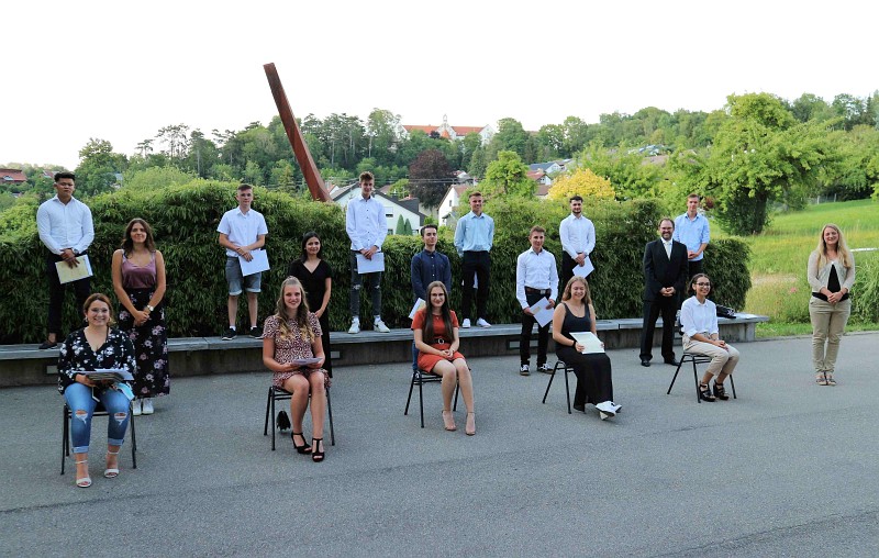 Auf etwas andere Art als üblich fanden auch die Abschlussfeiern des Berufskollegs an unserer Schule statt. Um die gebotenen Abstände einhalten zu können, wurden die Klassen Berufskolleg Wirtschaft, Berufskolleg mit Übungsfirma sowie Berufskolleg Fremdsprachen in getrennten Feiern verabschiedet, anstatt – wie in anderen Jahren üblich – jahrgangsweise. Insgesamt konnte 60 Absolventinnen und Absolventen des Berufskollegs zur erworbenen Fachhochschulreife gratuliert werden. Zudem absolvierten 31 der 60 Prüflinge mit Erfolg die Prüfung zum „Staatlich geprüften Wirtschaftsassistenten“. Für die musikalische Untermalung der Feiern zeichnete Studienrat Nils-Oliver Birkle verantwortlich.