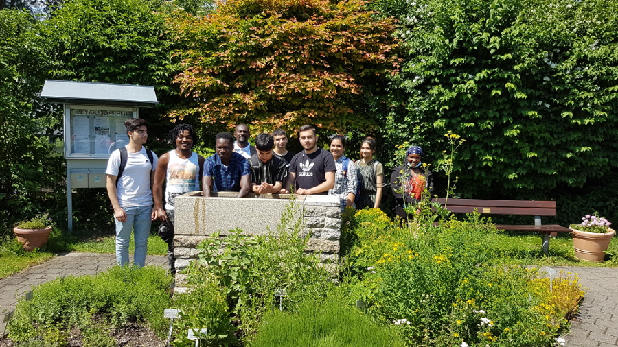 Die fröhlichen Sprung- und Landebilder sind auf der Stadtralley der VABO-Klasse entstanden. VABO ist die Abkürzung für „Vorbereitung Arbeit und Beruf, ohne Deutschkenntnisse – bzw. mit dem Schwerpunkt: Erwerb von Deutschkenntnissen“. Auch dieses Jahr beherbergte die Ludwig-Erhard-Schule wieder eine VABO-Klasse mit jungen Menschen „aus der ganzen Welt“, die hier schwerpunktmäßig Deutsch lernen, aber auch weitere allgemeinbildende Fächer haben und auch eine berufliche Vororientierung bekommen. Ziel ist es, dass die Schülerinnen und Schüler möglichst ein Sprach-Zertifikat auf der Grundlage des Gemeinsamen europäischen Referenzrahmens für Sprachen (GER) bekommen. Deshalb legen sie am Ende des Schuljahres eine Sprachprüfung in der deutschen Sprache in den 4 sprachlichen Grundkompetenzen: „Hörverstehen, Leseverstehen, Textproduktion (Schreiben) und Sprechen“ ab und zwar auf der Niveaustufe A2 und eventuell auch B1.