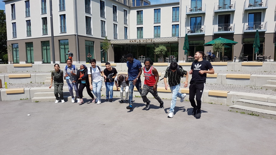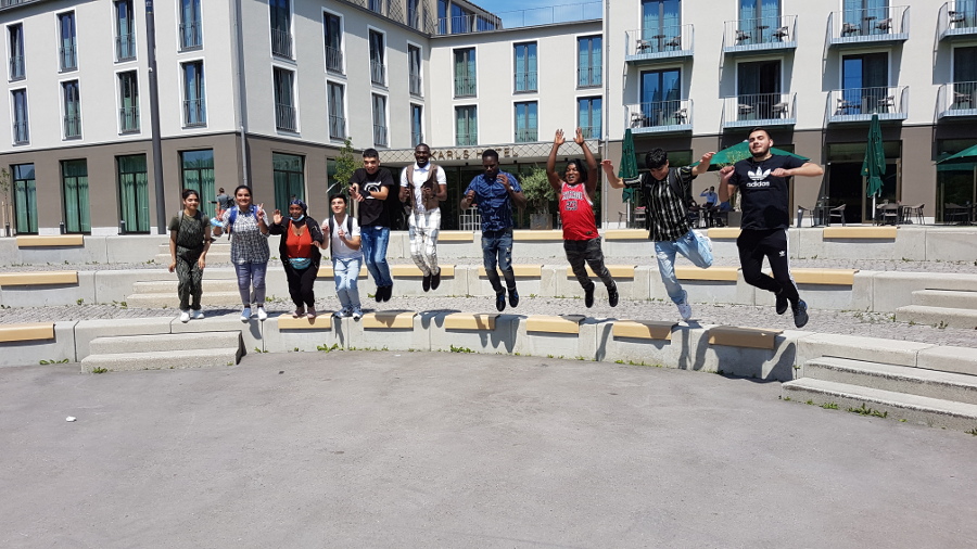 Bei der Nachbesprechung der Stadtralley in der nächsten Deutschstunde fassten es einige Schüler*innen in die schönen Worte: „Das ist ein Erinnerungsbild. Ich mag dieses Bild, weil wir hier alle glücklich sind.“ Dieser gemeinsame Sprung, das gemeinsame Erlebnis dieses schönen Tages hat uns miteinander verbunden – über die Unterschiedlichkeiten, die uns manchmal trennen, hinweg: eins, zwei, drei und Sprung! Klick!